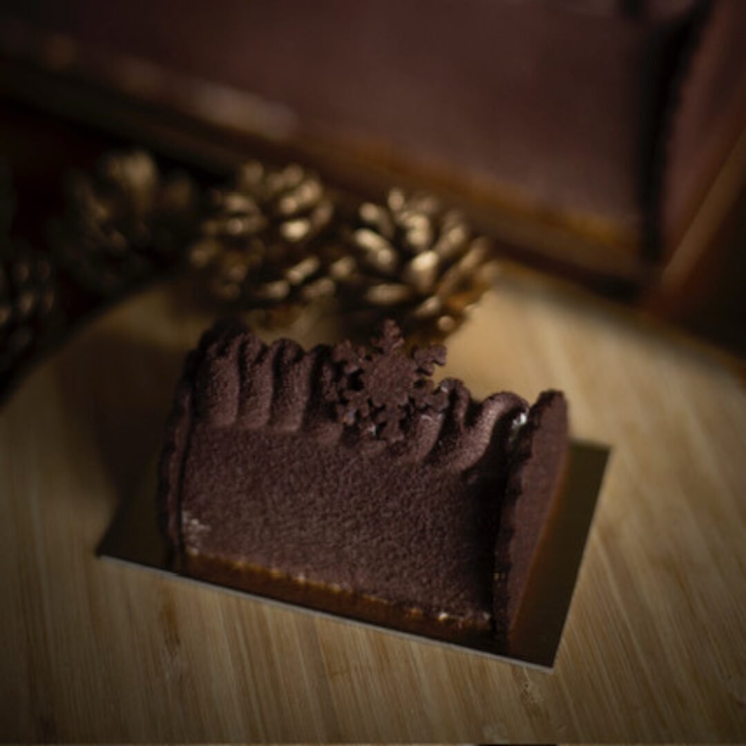 Au cœur de la bûche, un crémeux au chocolat noir vient renforcer la profondeur et l’intensité du dessert. Sa texture lisse et fondante en fait un incontournable pour les amateurs de chocolat pur.